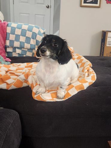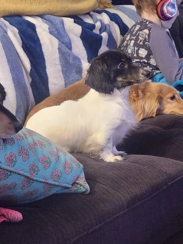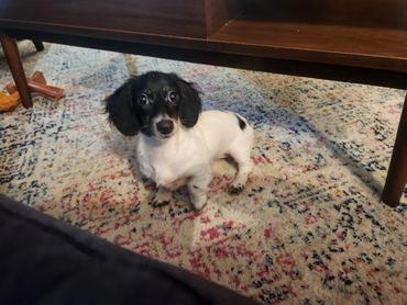 Pippa is a black and cream brindle piebald. She is 9 pounds.
